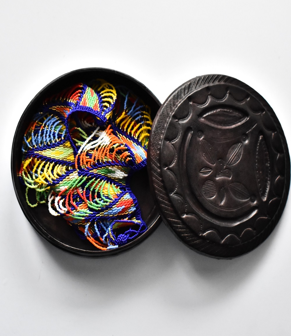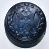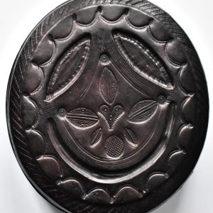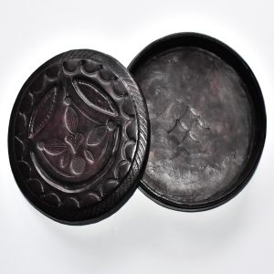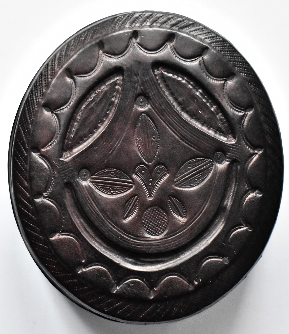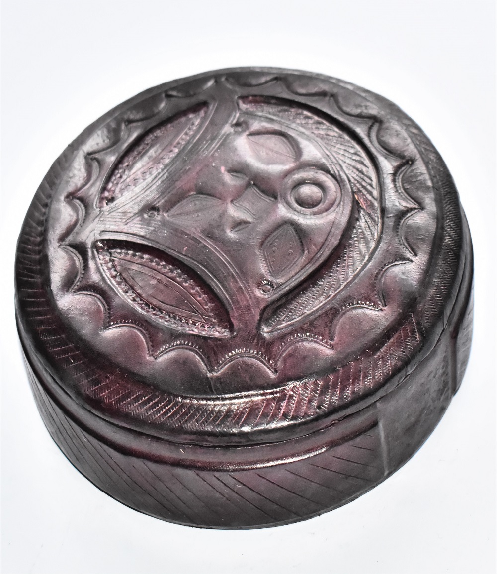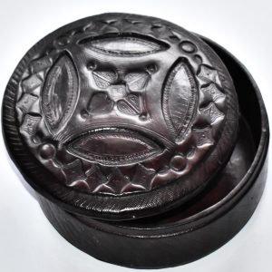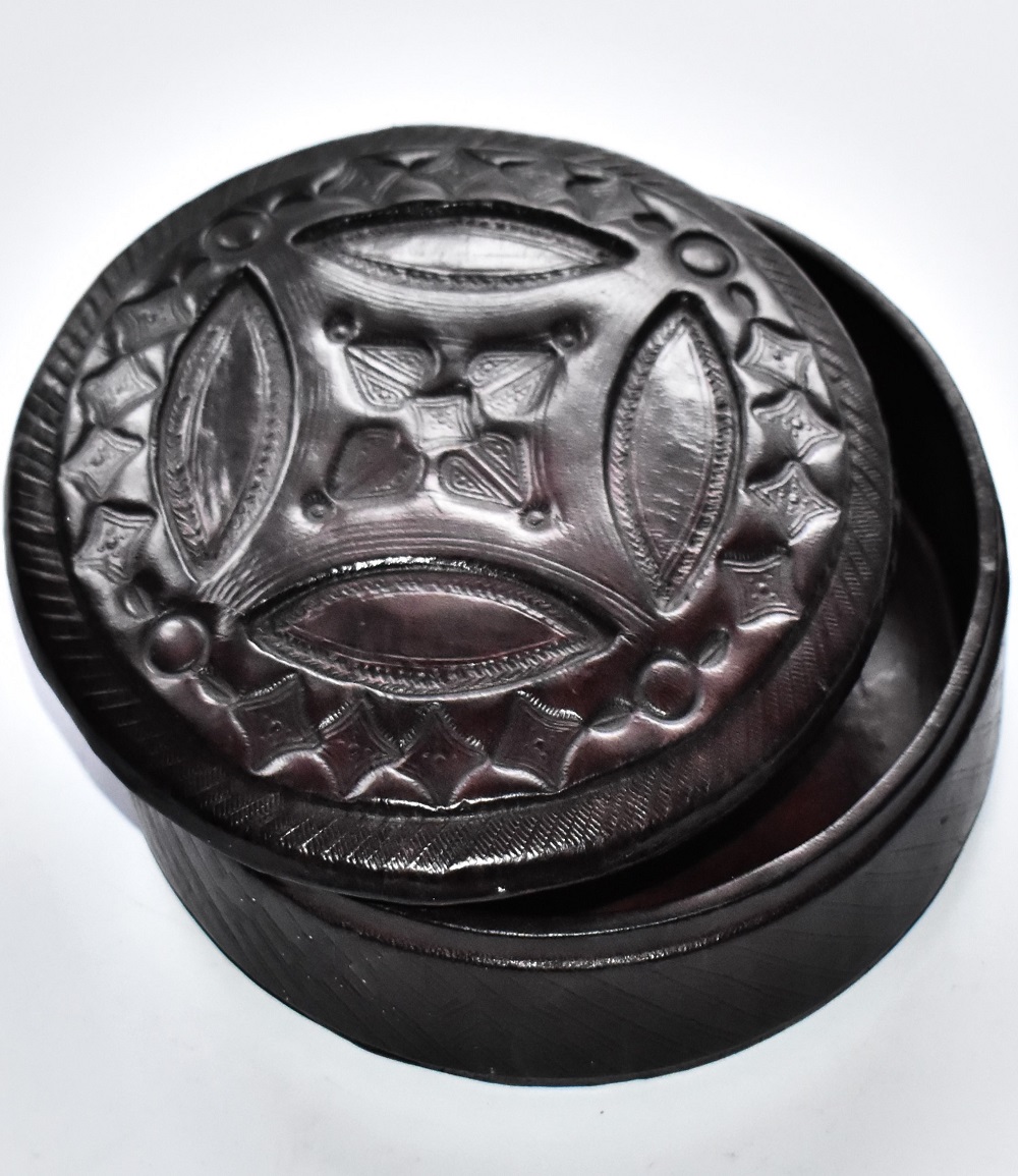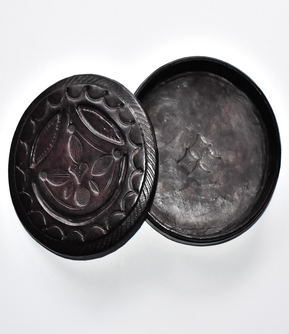 Boite à bijoux ou de rangement ronde en bois recouvert de cuir ciselé tanné artisanalement, finement décorée avec finitions soignées