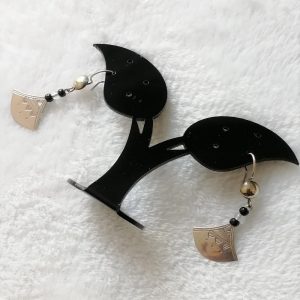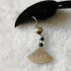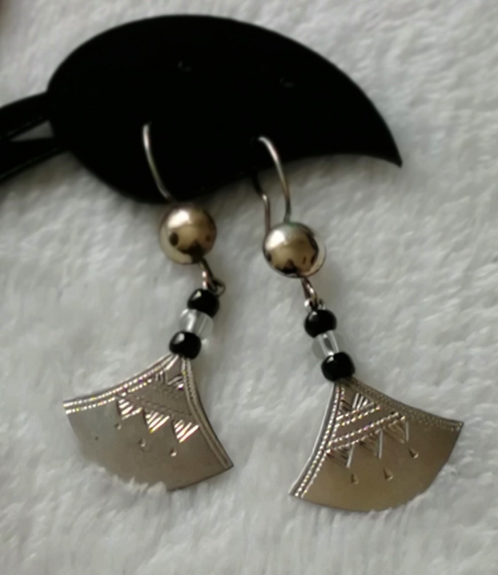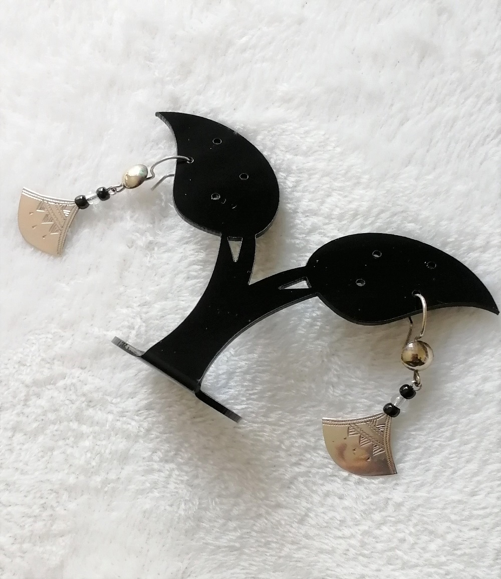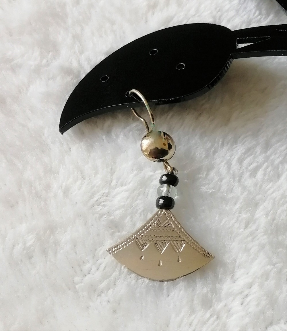 Boucles d’oreilles traditionnelles de l’artisanat touareg, en alliage argent et bronze, en forme de triangle arrondi surmonté de perles, gravure motifs traditionnels, fermoir en forme de crochet