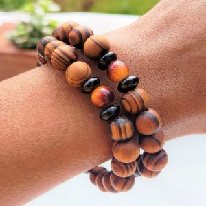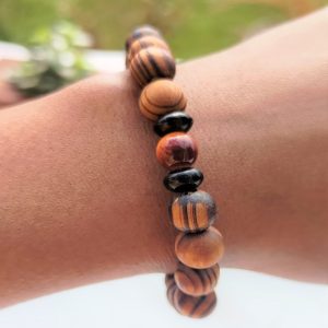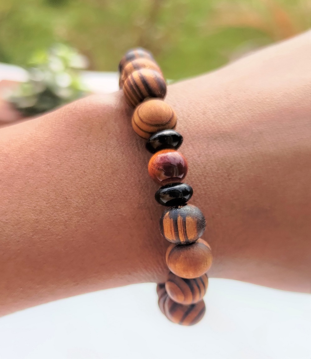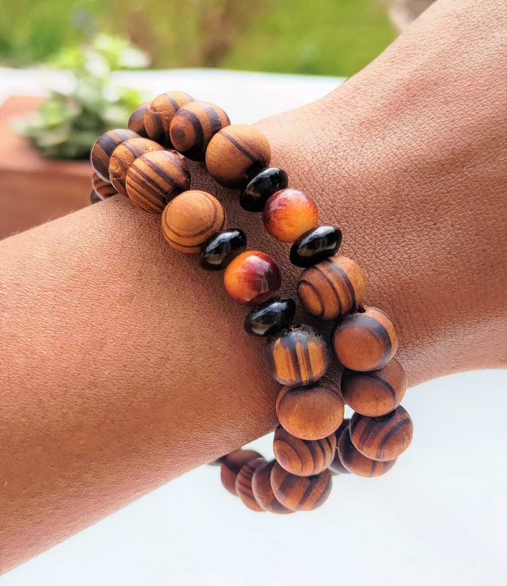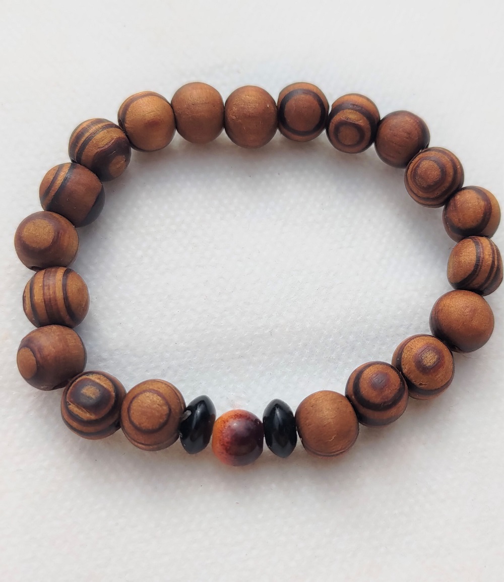 Bracelet en grosses perles en bois naturel foncé, avec ornements en perles de couleurs différentes