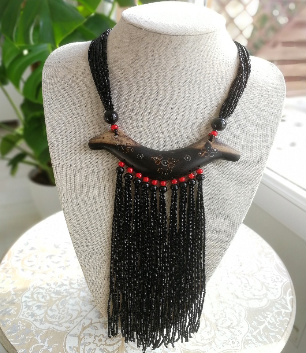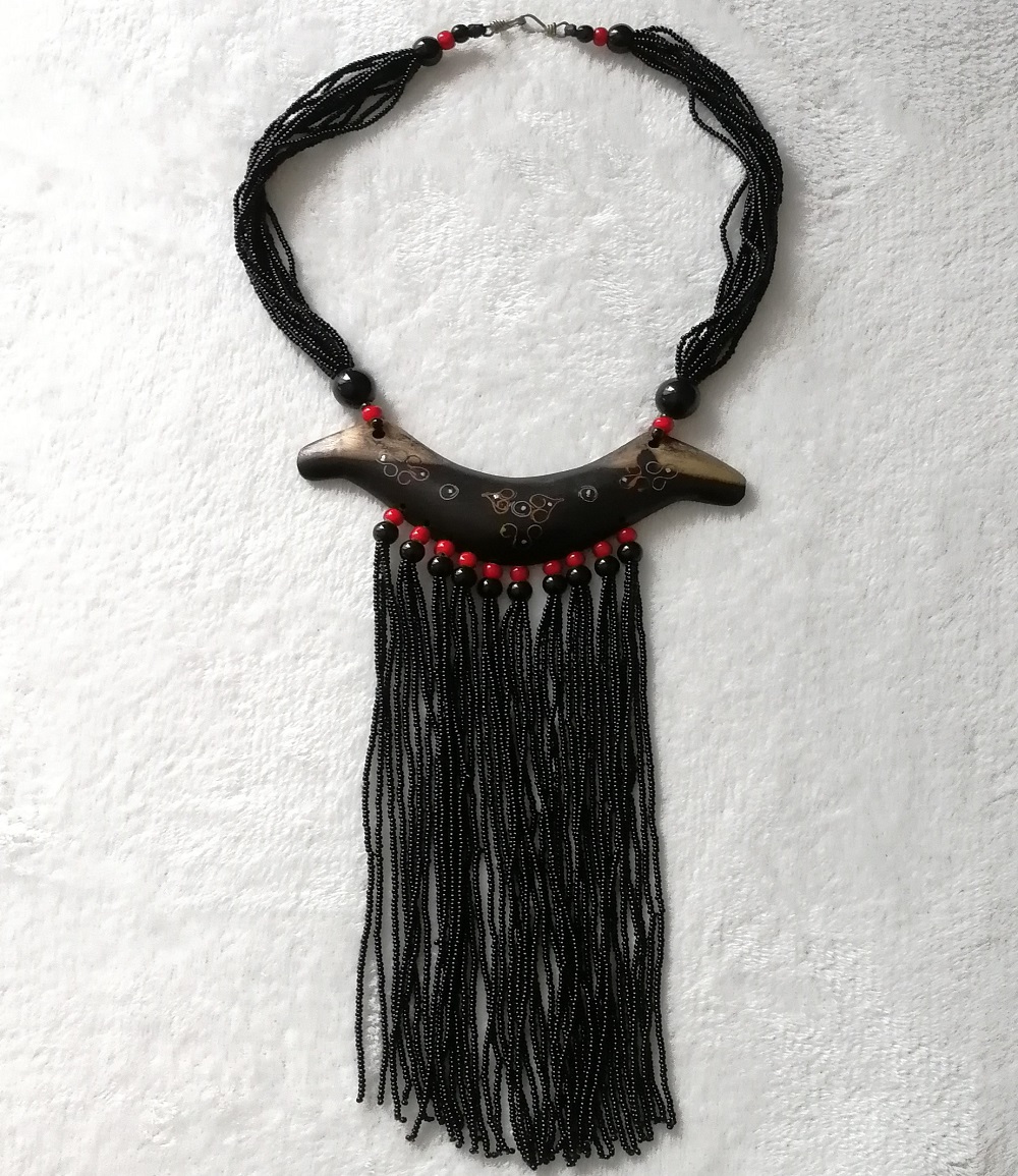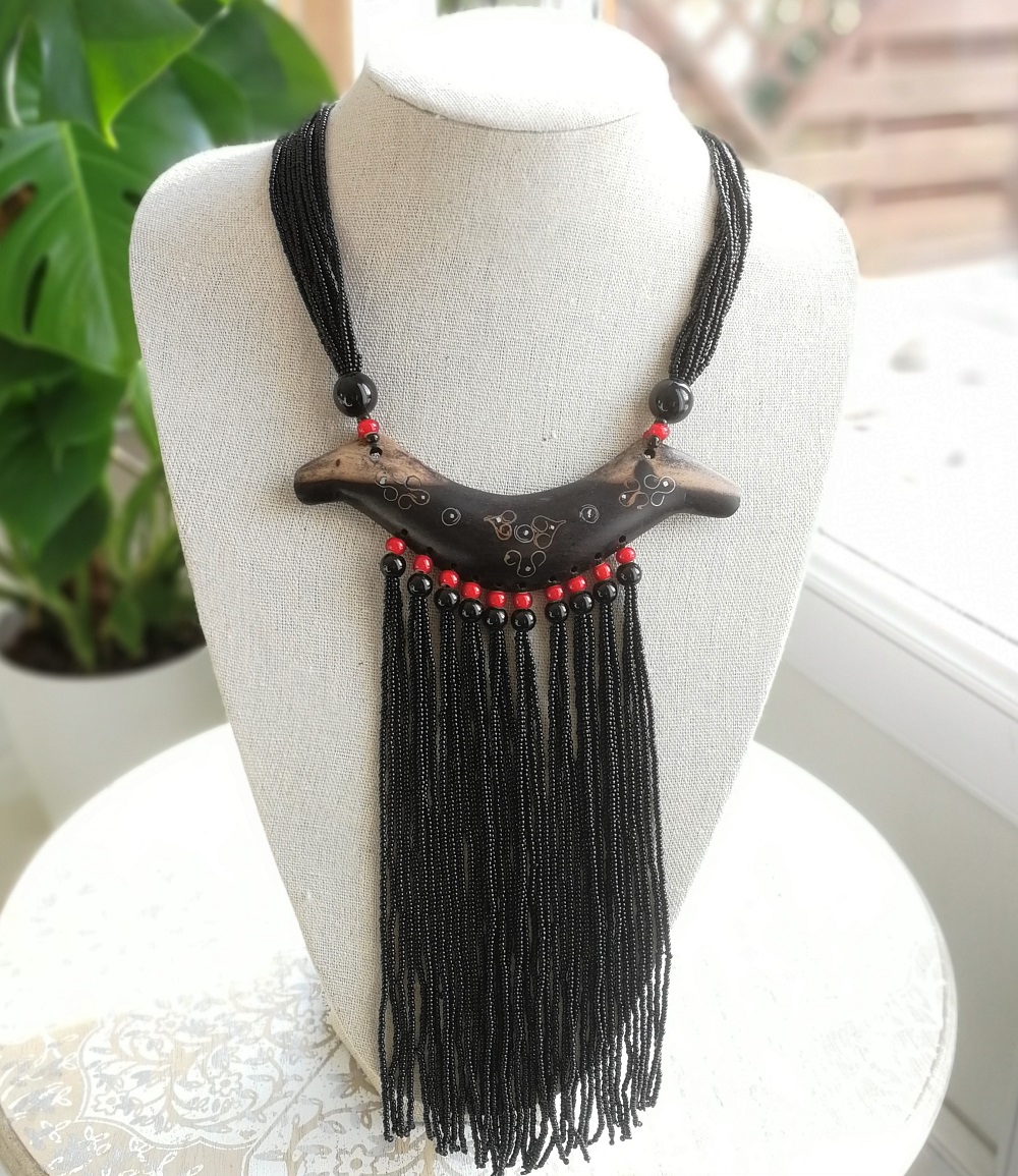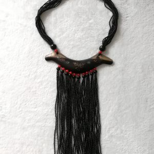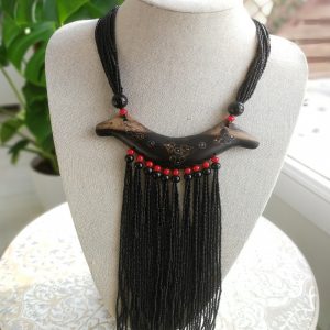 Collier en perles noires et rouges et bois d’ébène fait et décoré entièrement à la main