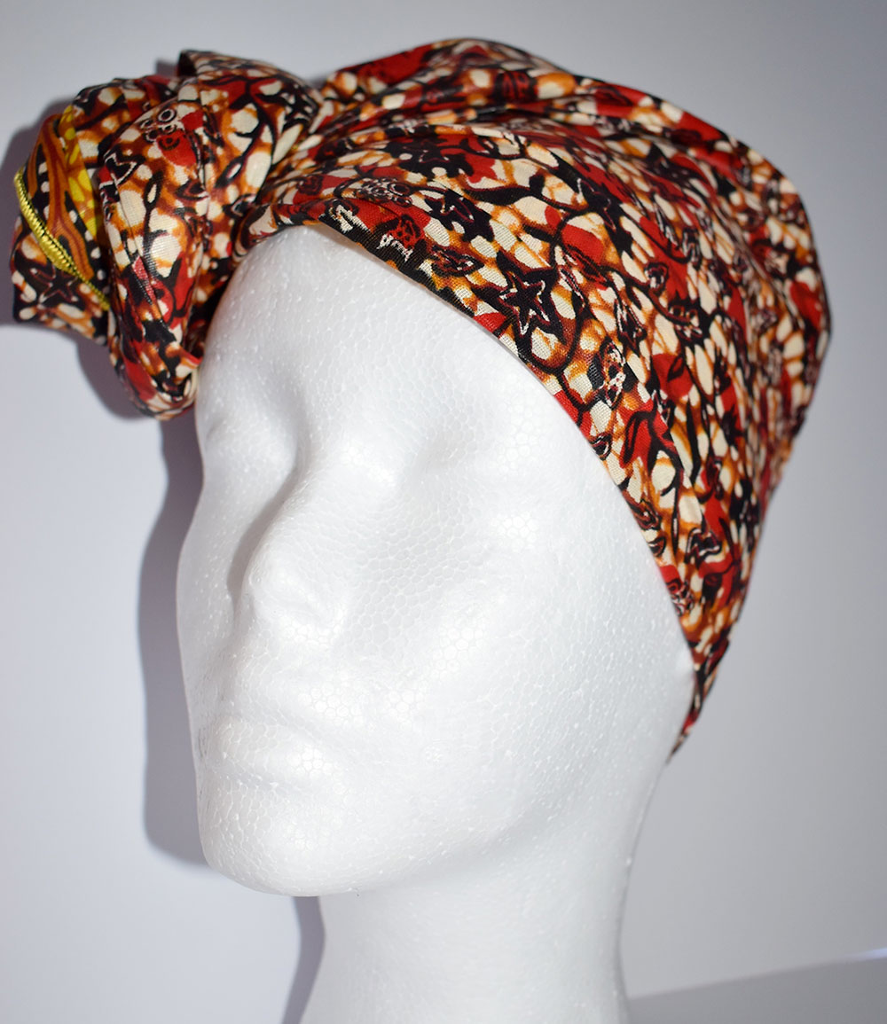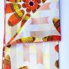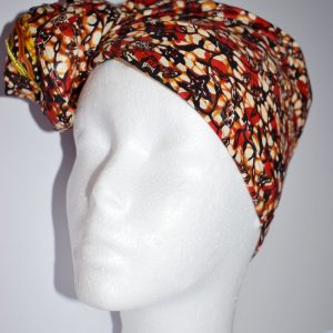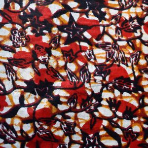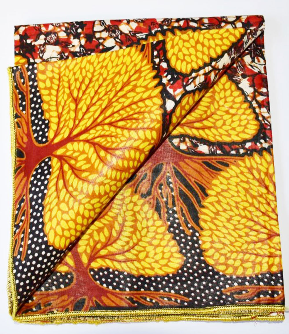 Foulard en wax, motif arbre enraciné, couleur dominante orange et rouge surfilage jaune sur les bords
