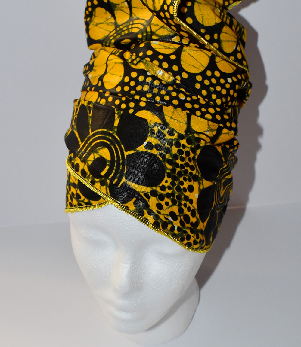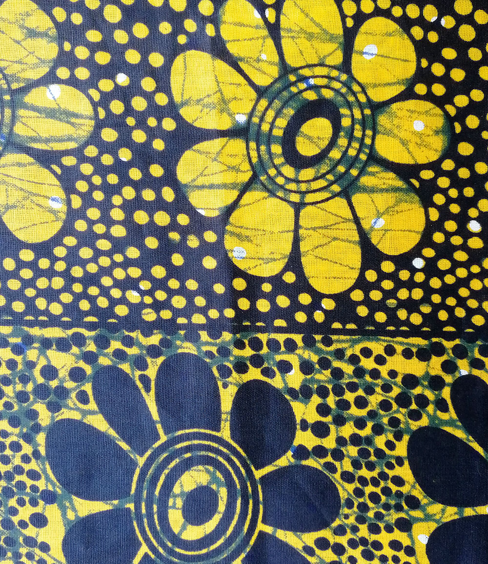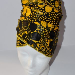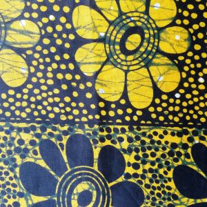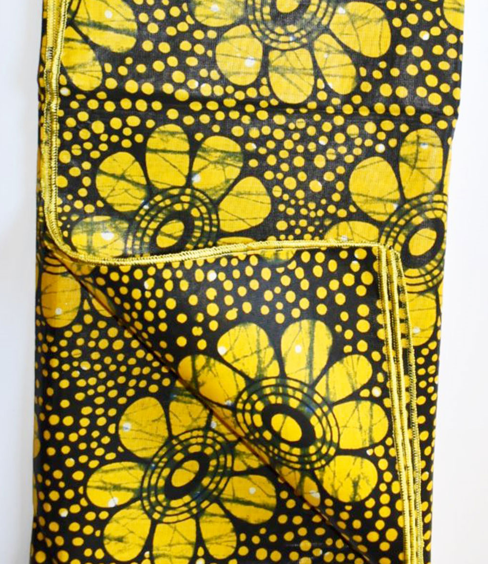 Foulard en wax, motif Fleurs jaunes, couleur dominante jaune et noir avec surfilage jaune sur les bords