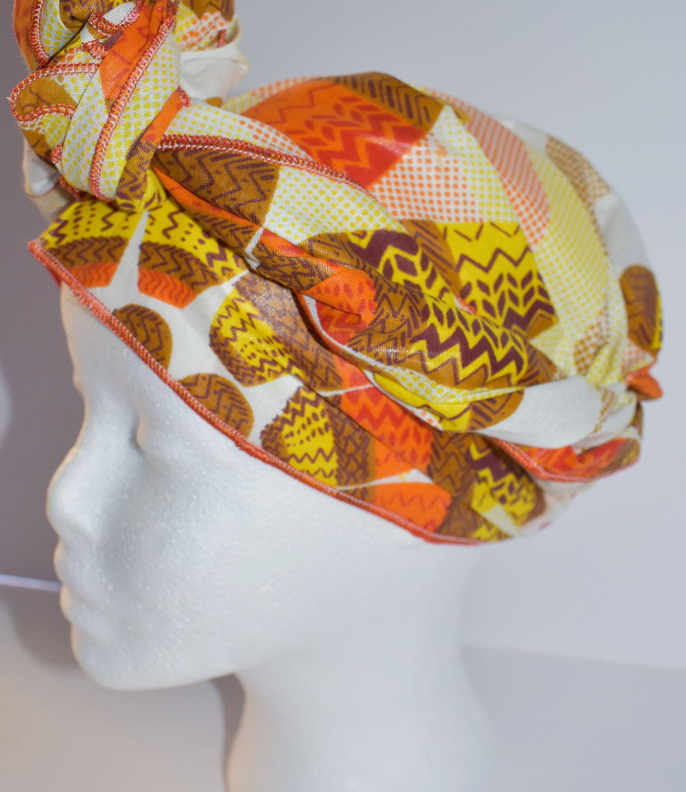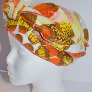 Foulard en wax, motif roue orangée, couleur dominante blanc et orange avec surfilage orange sur les bords