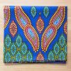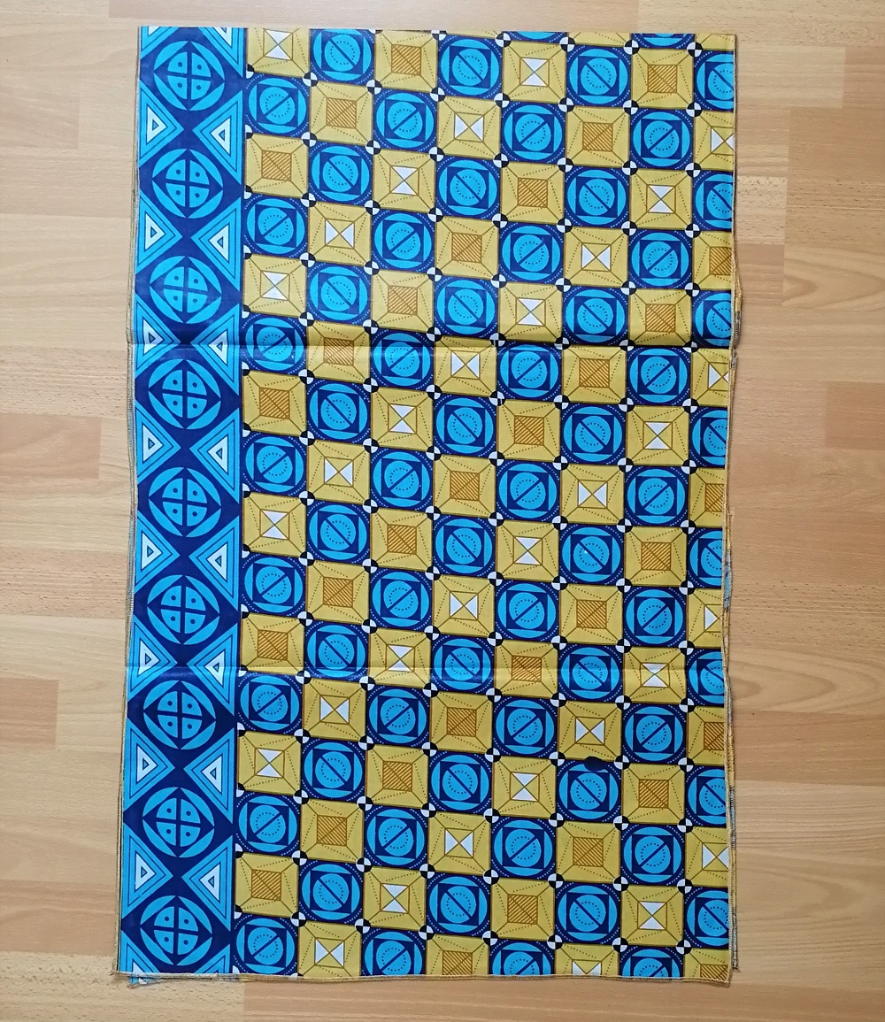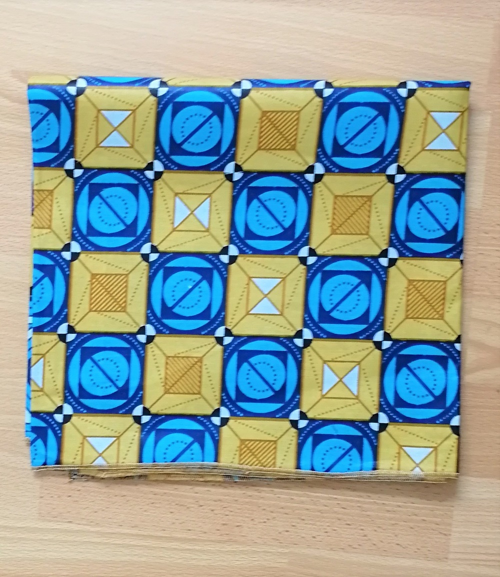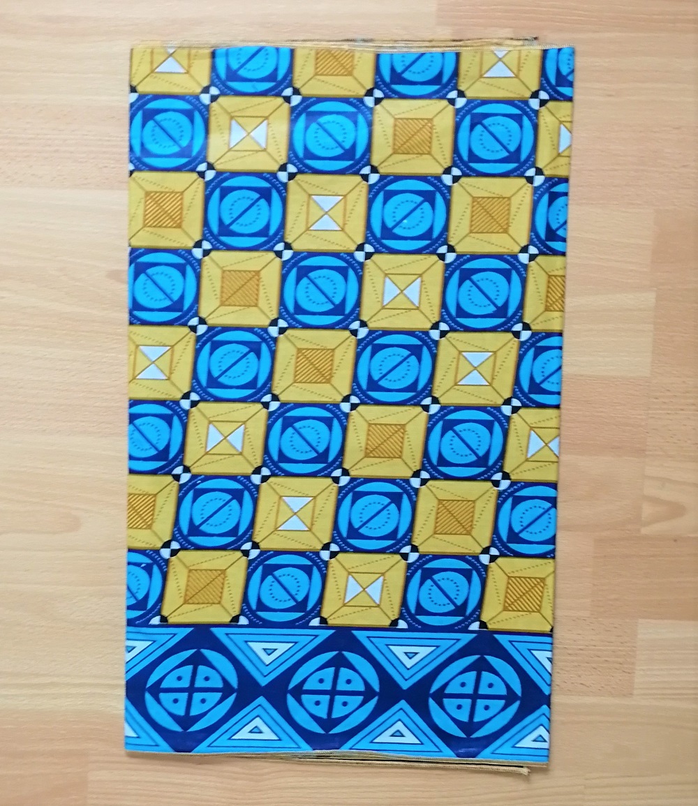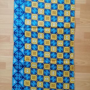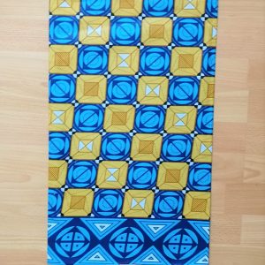 Foulard en wax, motif imprimé Carrés, couleur dominante bleu et jaune avec surfilage jaune sur les bords