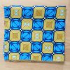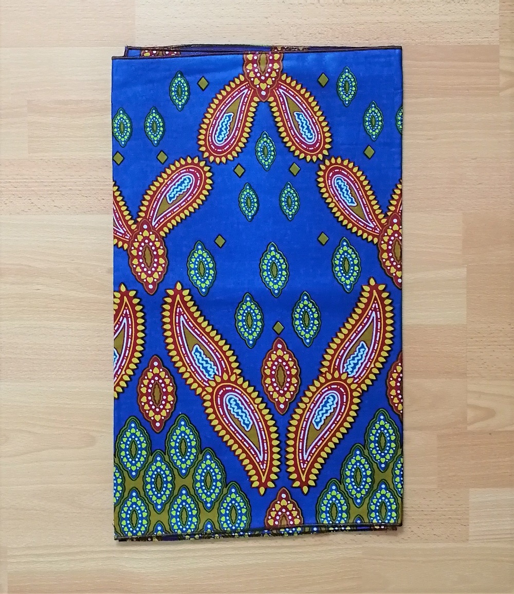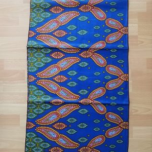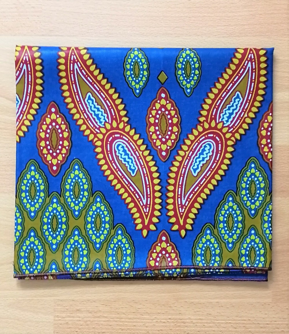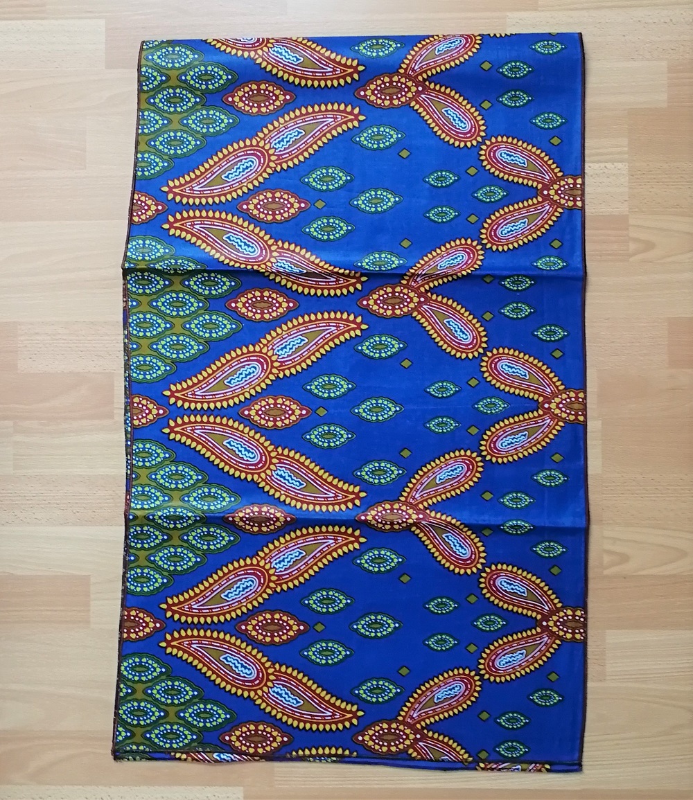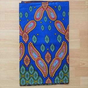 Foulard en wax, motif imprimé coquillage, couleur dominante bleu et vert avec surfilage noir sur les bords