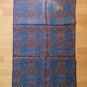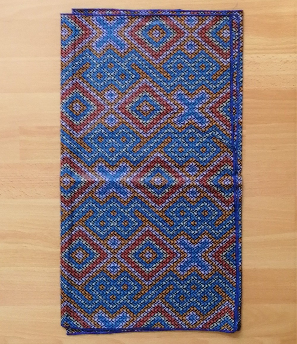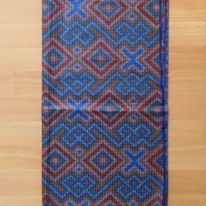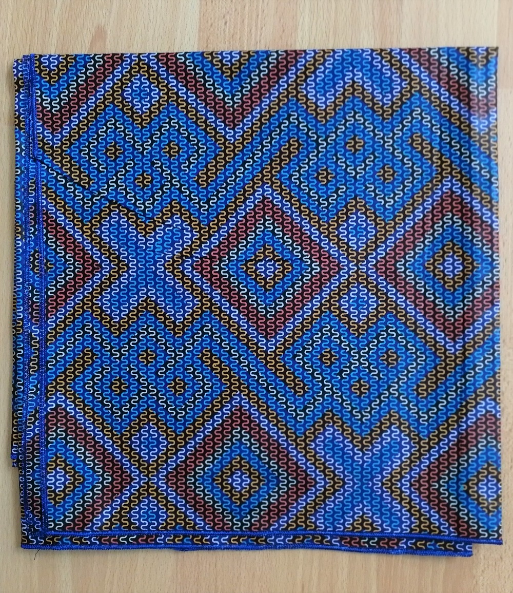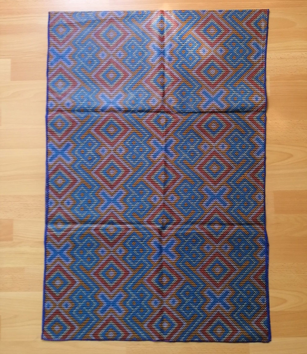 Foulard en wax, motif imprimé Croix et Losange, couleur dominante bleu et gris avec surfilage bleu sur les bords