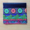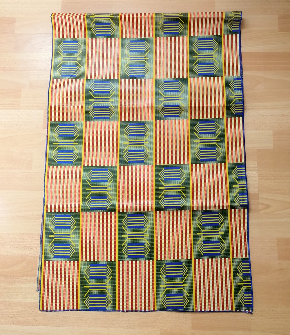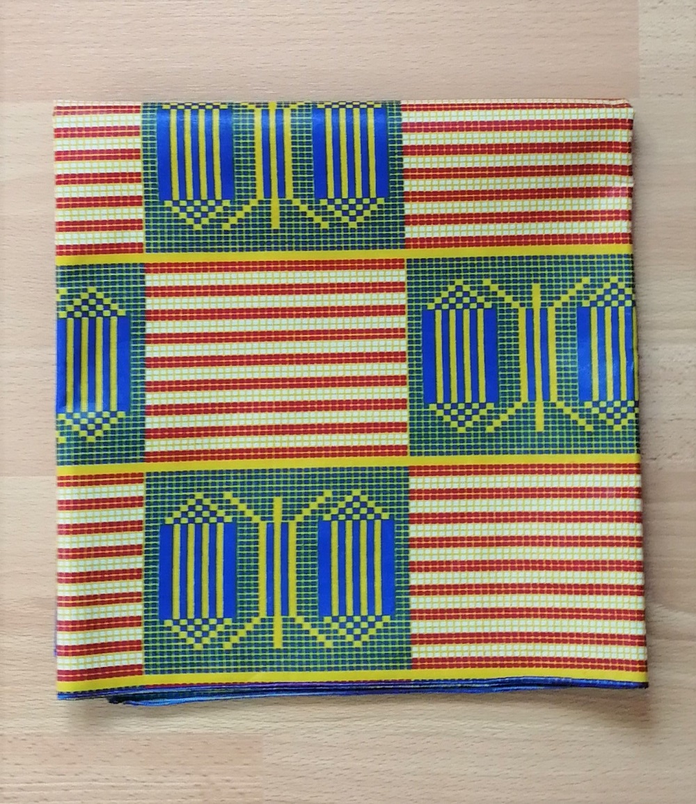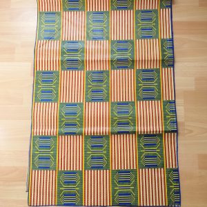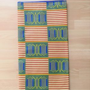 Foulard en wax, motif imprimé Ethnique clair, couleur dominante vert et beige avec surfilage bleu sur les bords