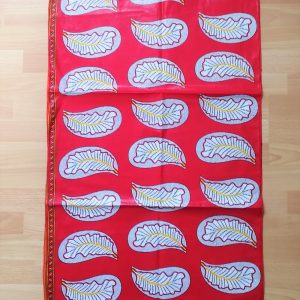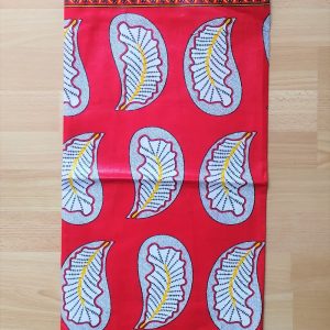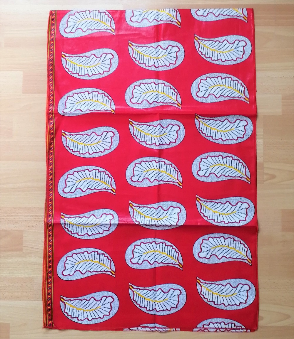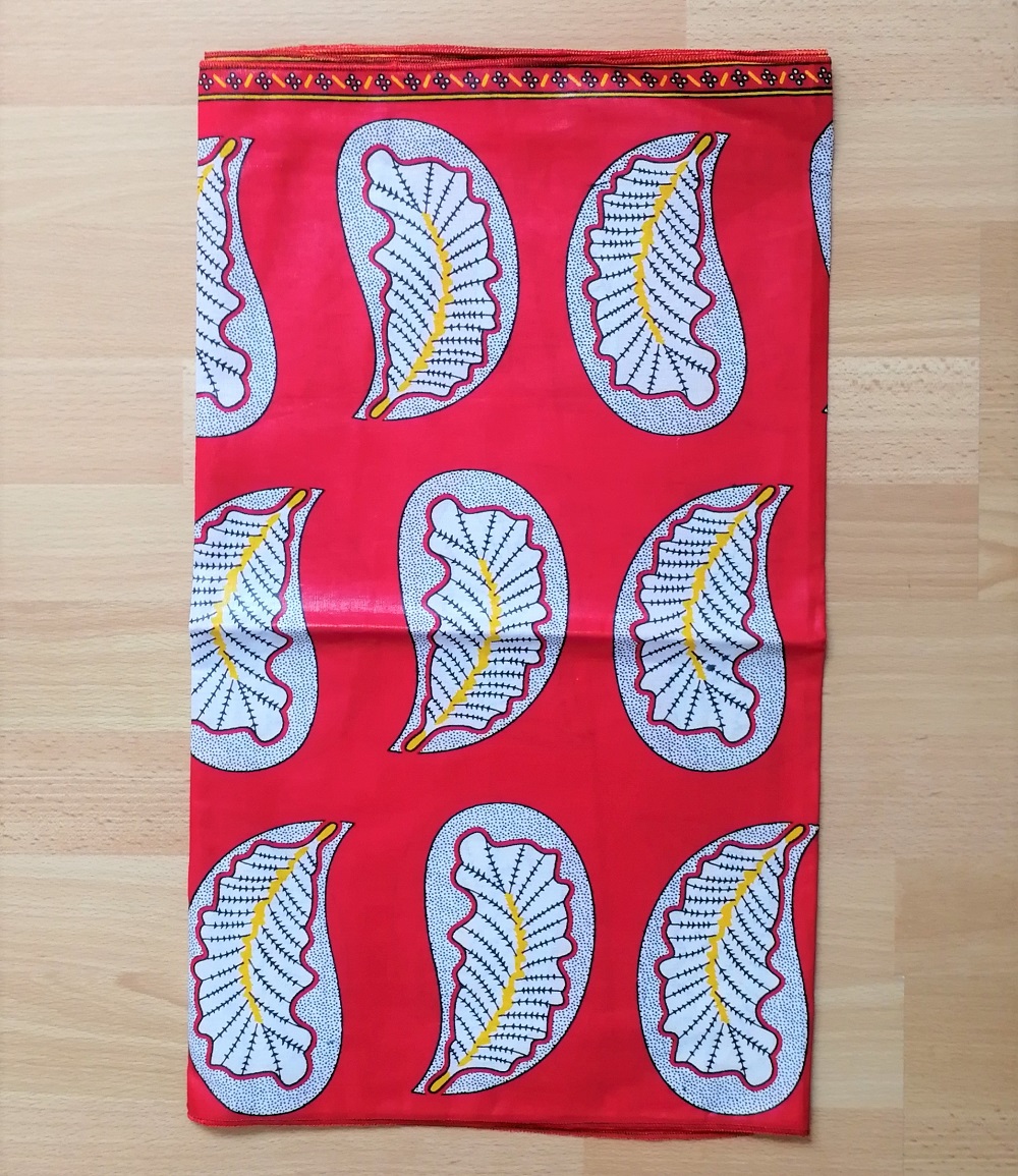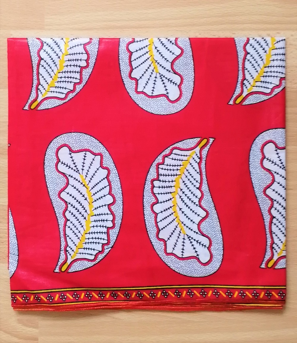 Foulard en wax, motif imprimé feuilles blanche, couleur dominante rouge avec surfilage rouge sur les bords