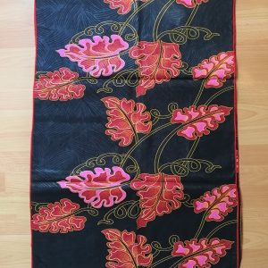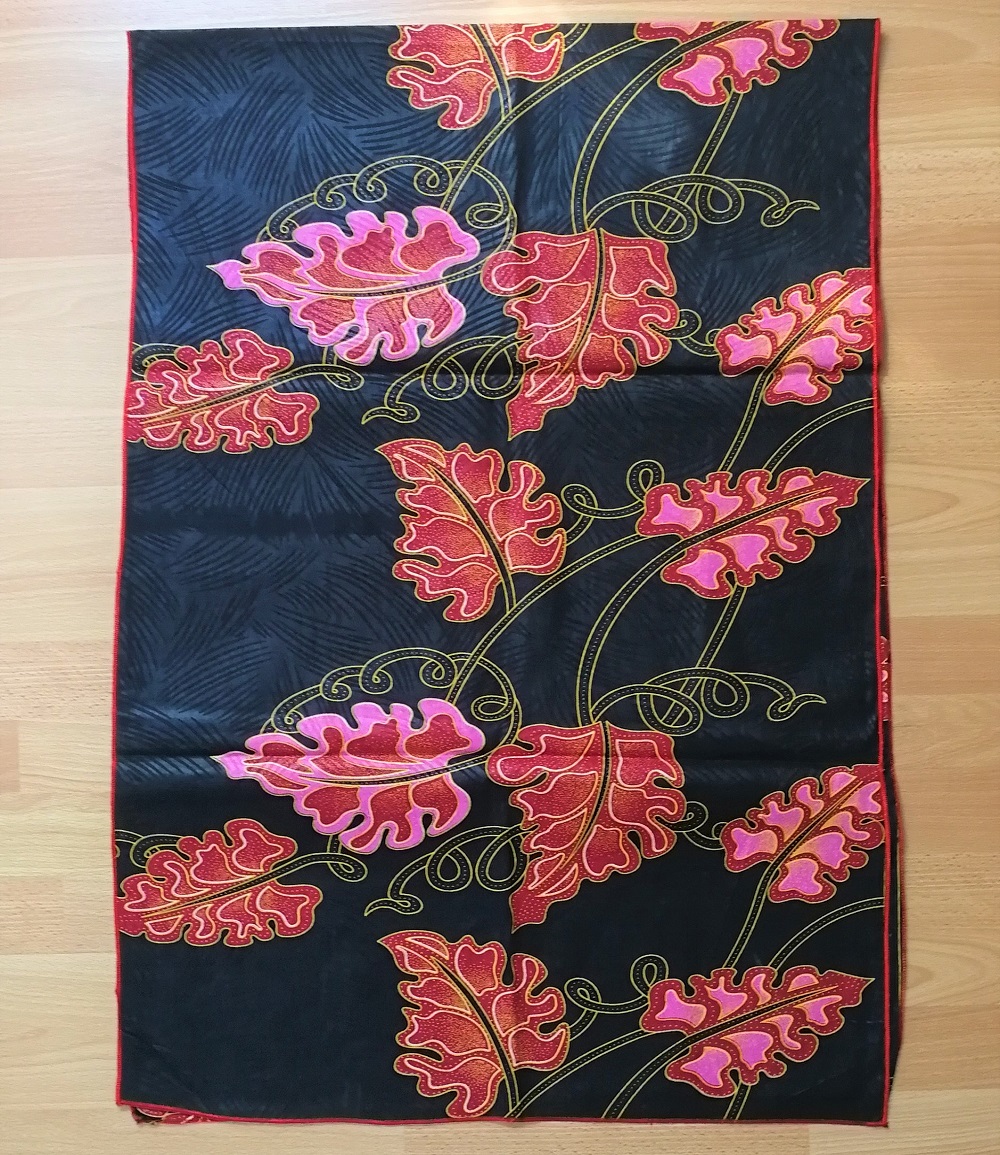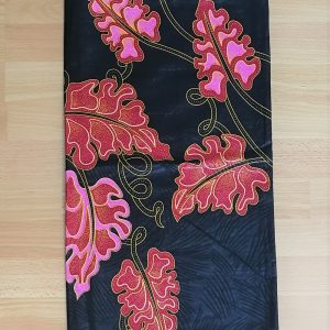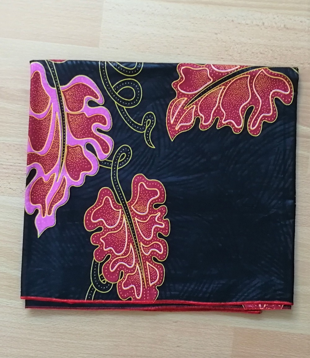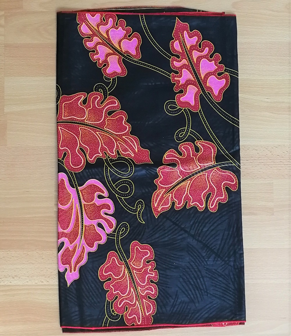 Foulard en wax, motif imprimé Grandes Feuilles, couleur dominante noir et rose avec surfilage rouge sur les bords