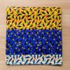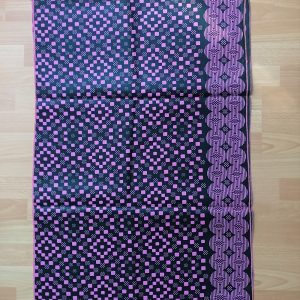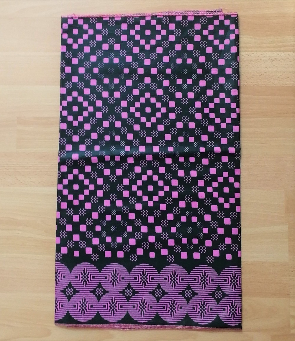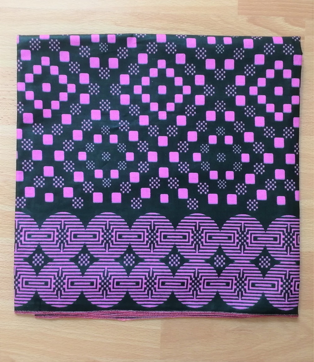 Foulard en wax, motif imprimé petits carrés, couleur dominante violet avec surfilage rose sur les bords