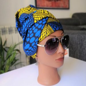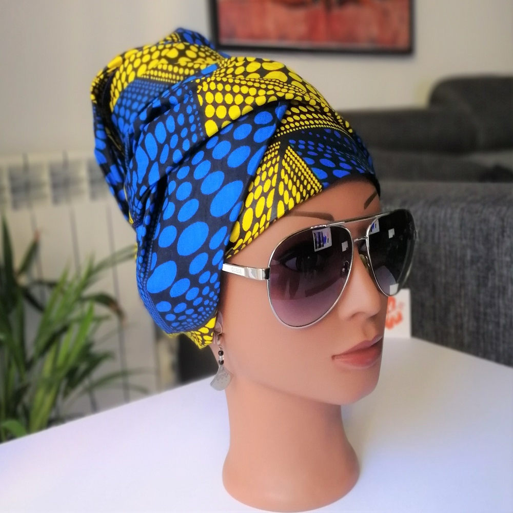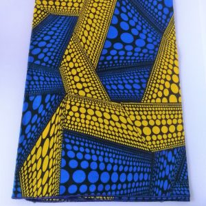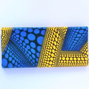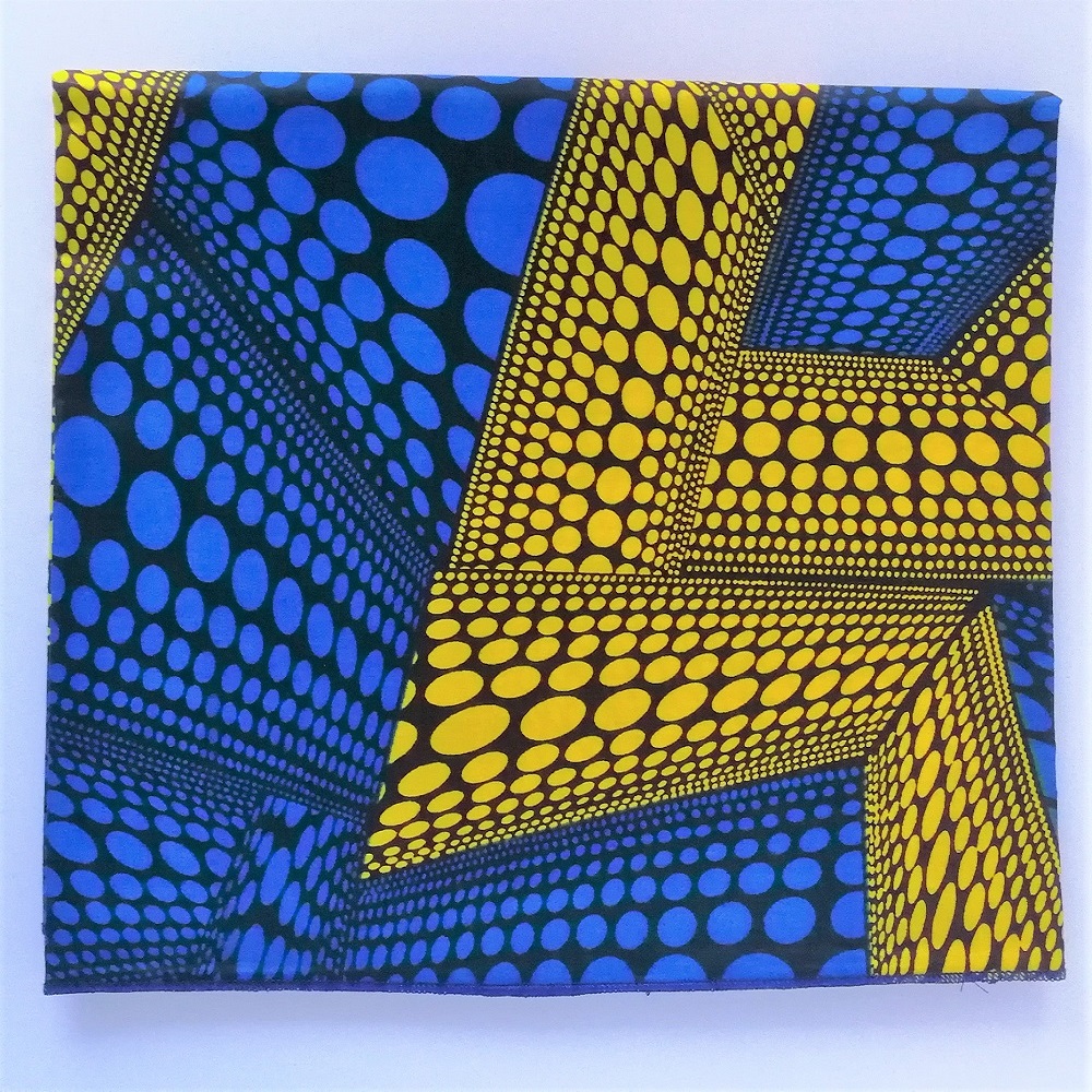 Foulard en wax, motif imprimé ronds, couleur dominante bleu et jaune avec surfilage bleu sur les bords