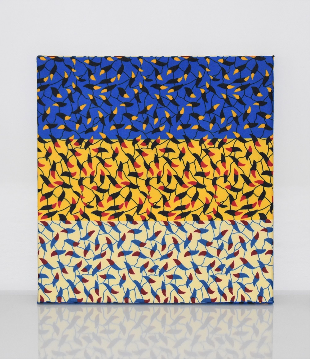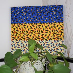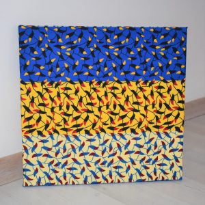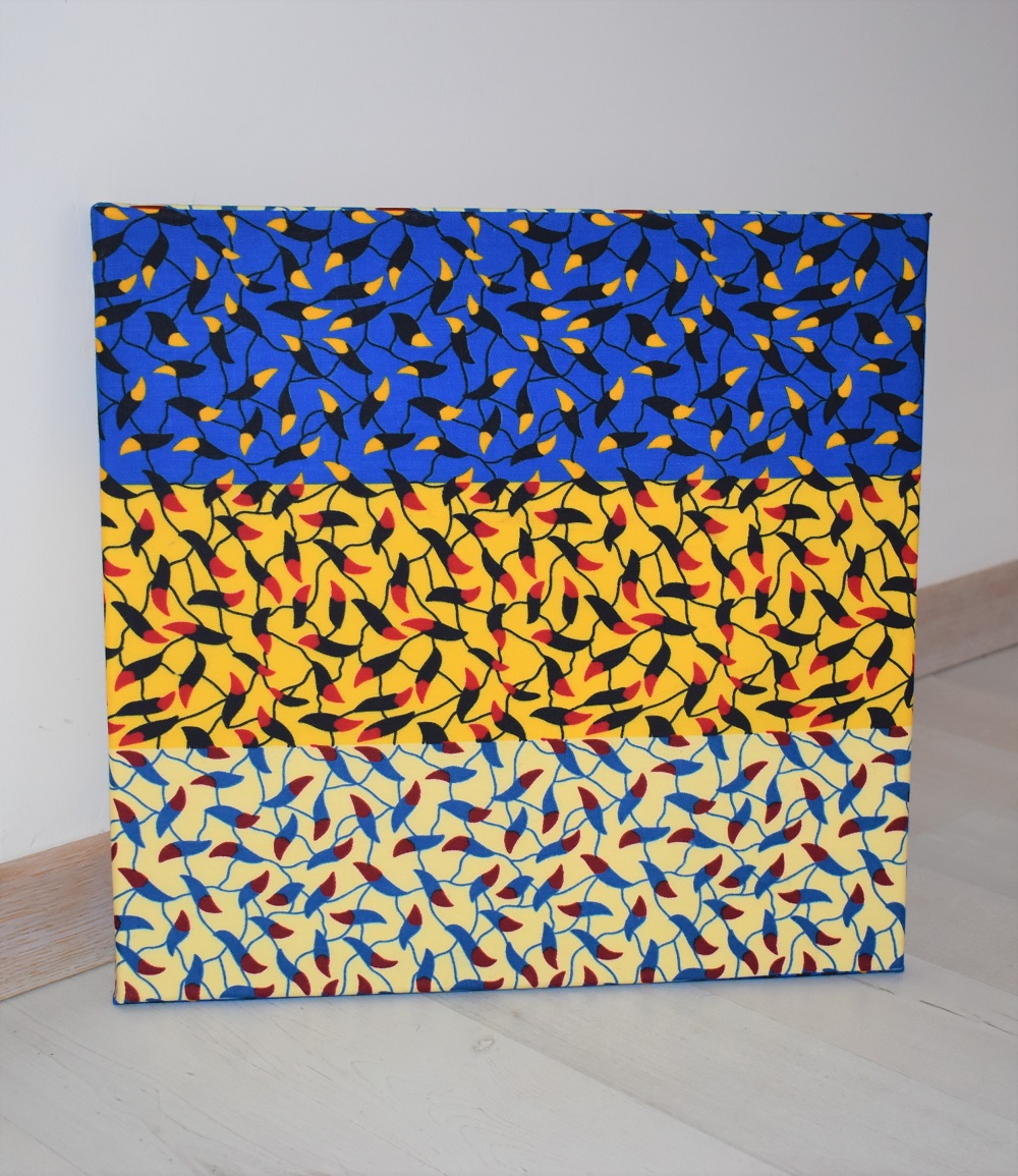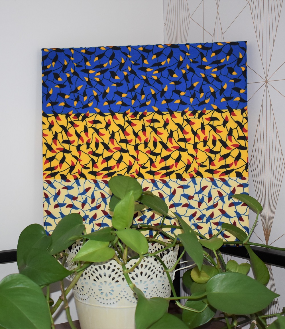 Création Exclusive Kassaora!! Magnifique tableau décoratif confectionné avec un pagne Wax, motif imprimé Petites Feuilles sur 3 couleurs. Optez pour une touche colorée et originale chez vous!