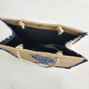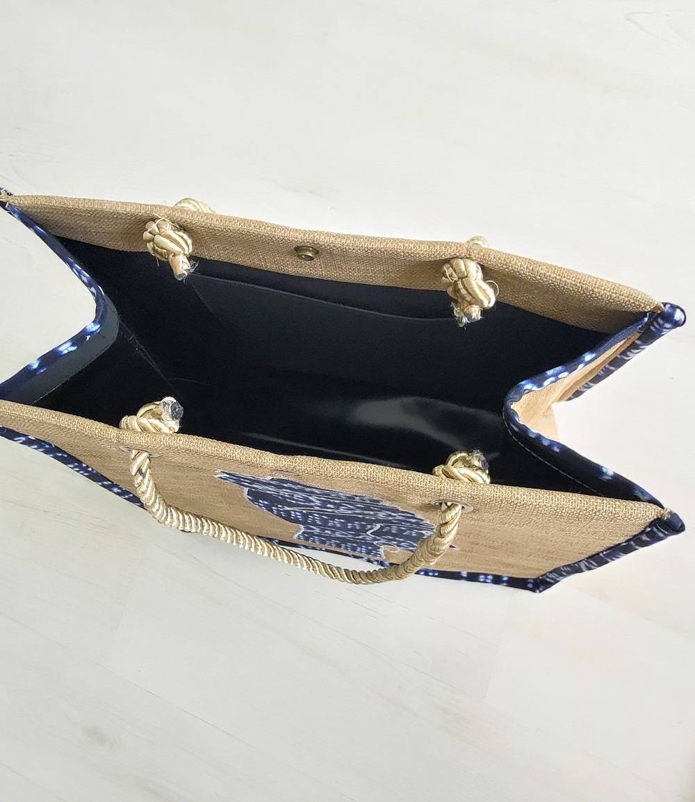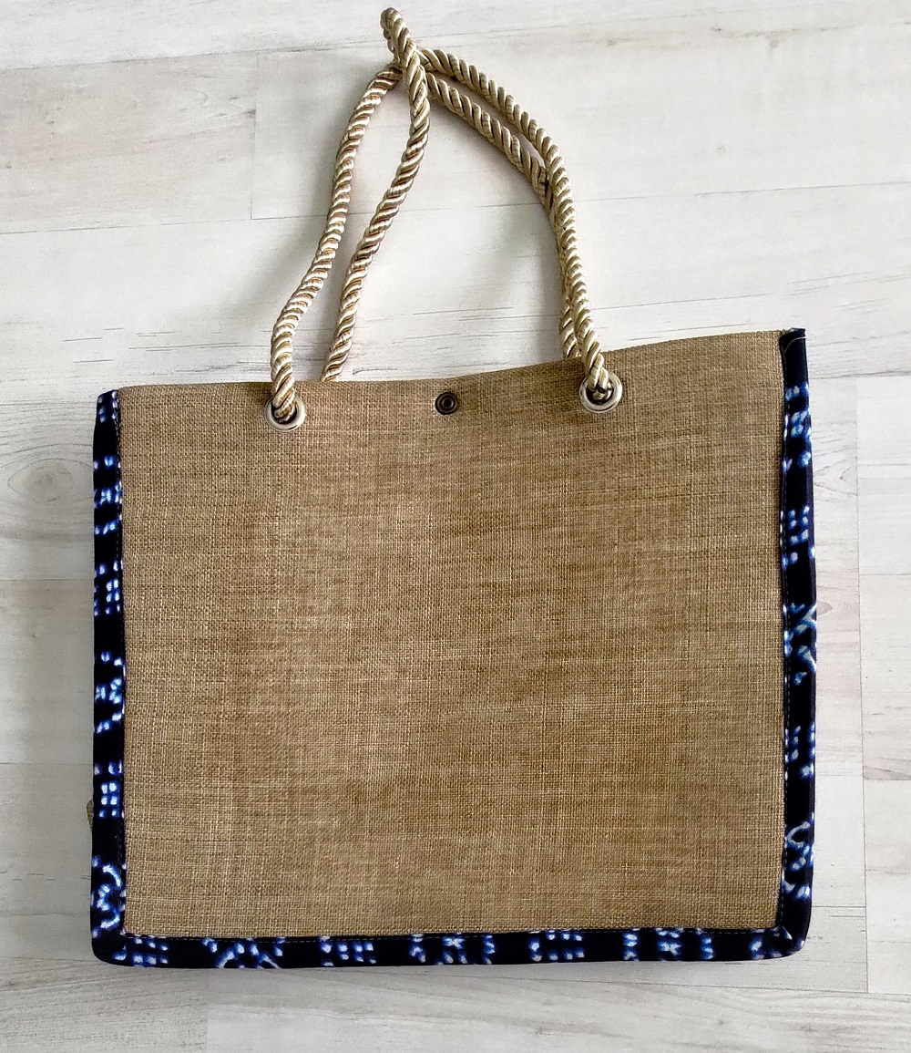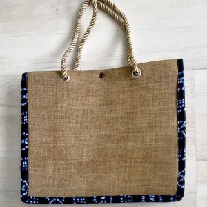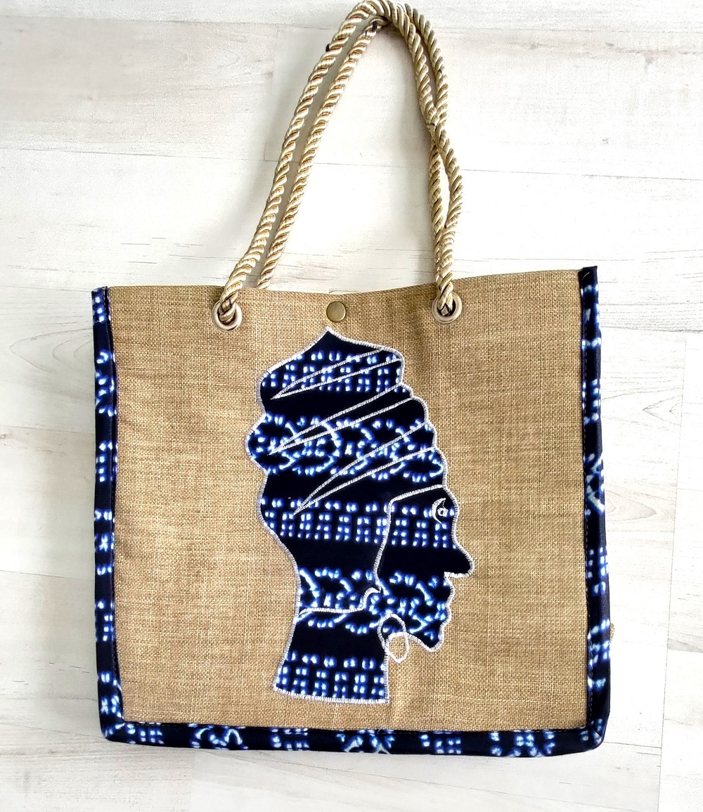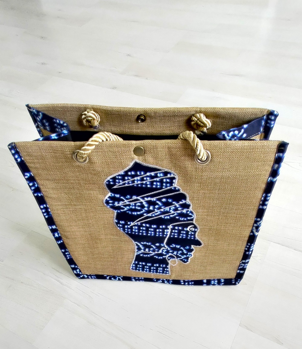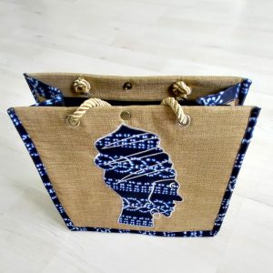 Exclusivité Kassaora!! Magnifique sac de type cabas, entièrement fait main en toile de jute avec comme motif une femme africaine en décor wax. Sac écologique, résistant et imperméable avec une solide doublure en polyester et une poche intérieure sur le côté. Modèle unique. Sac à porter idéalement durant les beaux jours ou selon vos envies pour vous démarquer avec originalité.